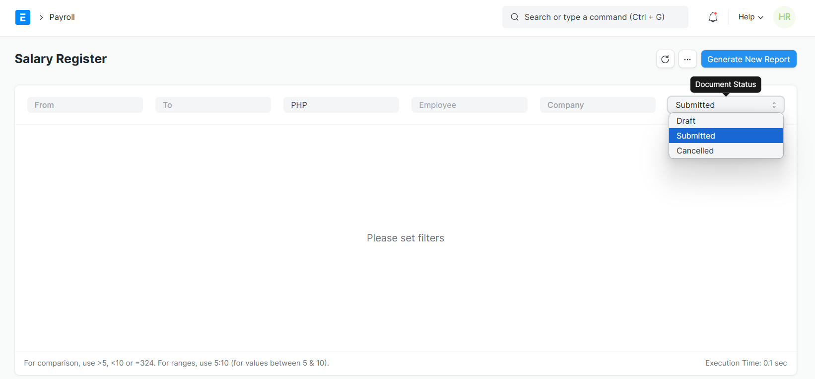 Select the From and To date, Company, and Document status of the salary register you wish to see. For Further narrowing of data, you can use Employee Filter as well. Then, click Generate Report.