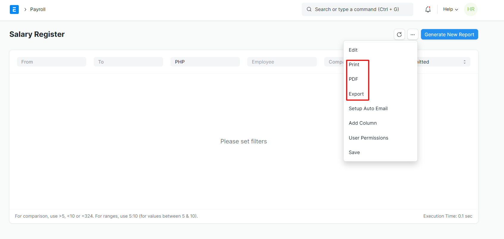 Salary Register Report allows the user to generate all the salary components present in the payroll based on the date filters used.